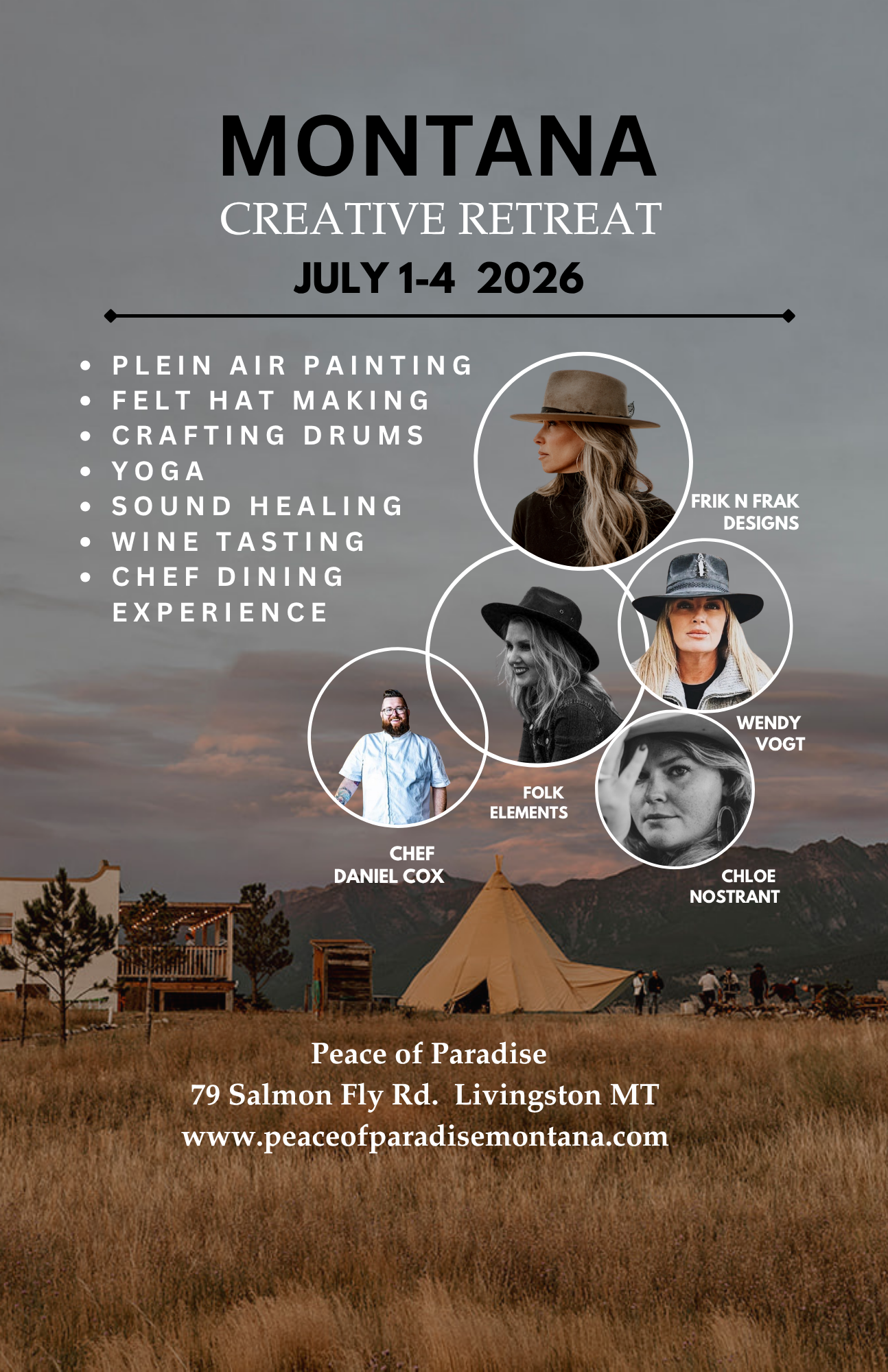 Join us for our second annual creative retreat! We’ve intentionally curated experiences with local artists that invite you to slow down and fully engage your senses. Each scheduled gathering has been thoughtfully designed to move beyond observation and into participation, blending hands-on creativity and meaningful connection. This retreat is more than a series of events; it’s a collection of intentional experiences created to inspire you to pause and enjoy the energy of collaboration. We will create handmade drums from natural hides with Folk Elements, plein air paint among the mountains with artist Wendy Vogt, and make custom hats with Frik n Frak together! Live music, private “TIPI” dinner with Chef Daniel Cox, and the Livingston Round Up rodeo are all part of the experience!